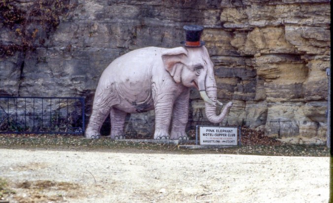 I located this original elephant from Pink Elephant Social Club. Although the club has since closed, the top hatted elephant is still in Marquette, where they have a slightly more detailed story of it’s origins. They claim that pink was originally made for a 1964 Republican Convention in Sparta Michigan, and was normal elephant grey. Once it became homeless after the convention and drinking laws changed in Iowa, the elephant was adopted by the new club and painted pink. My only impression of the symbolism of pink elephants comes primarily from a scene in Dumbo, and is that they denote hallucination or drunkenness. So a pink elephant mascot for a bar formed under new drinking laws make perfect sense. What they have to do with gas stations or the other businesses Ive found with pink elephants, I have no idea.